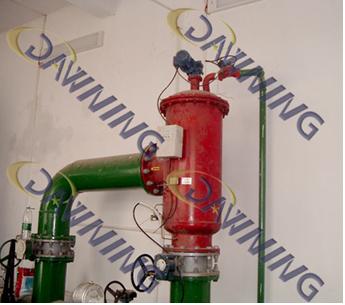 現(xiàn)場安裝圖,圖中立式自清洗過濾器室內(nèi)安裝,下進(jìn)側(cè)出,右邊小管道與排污口連接方便導(dǎo)出排出的雜質(zhì)。